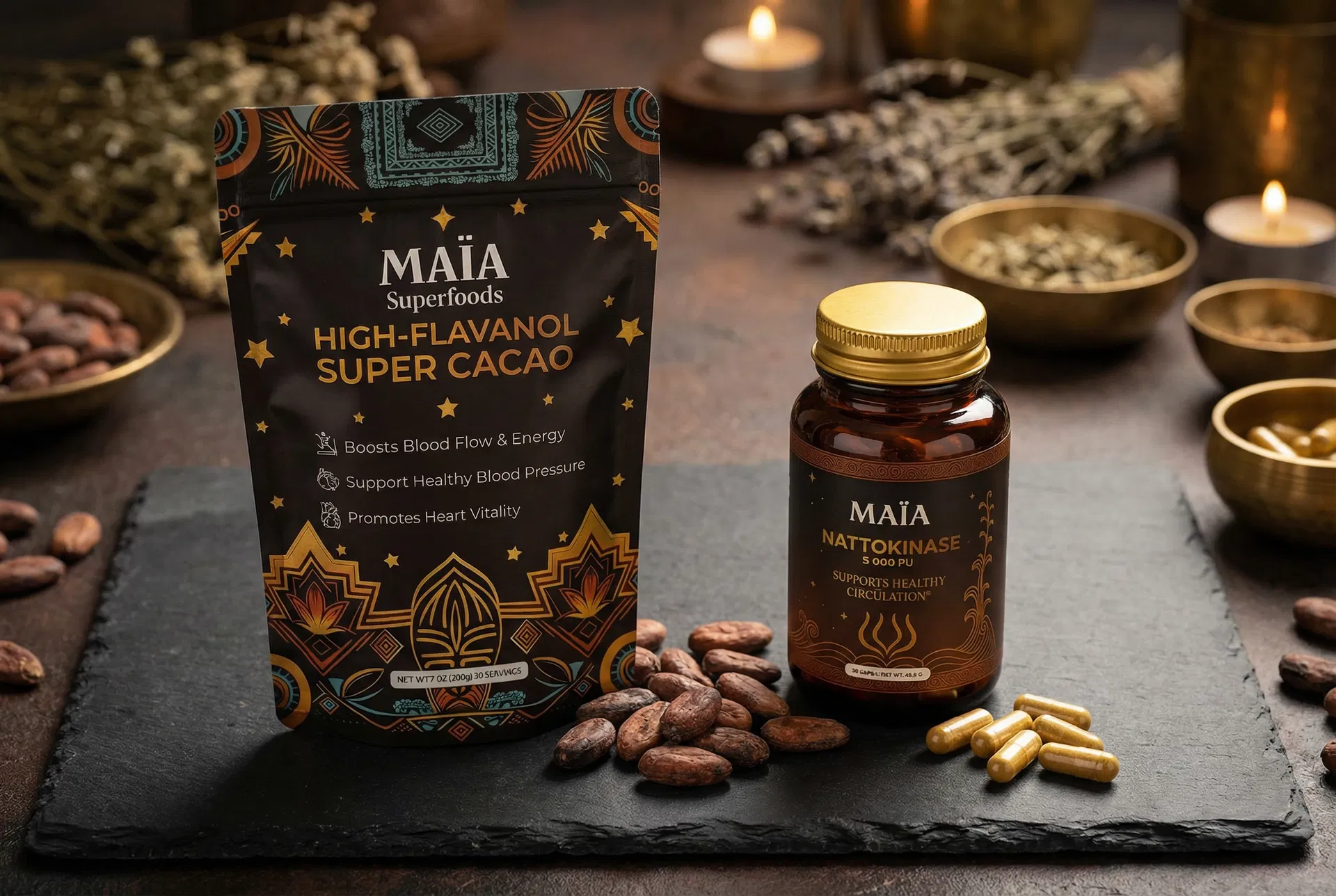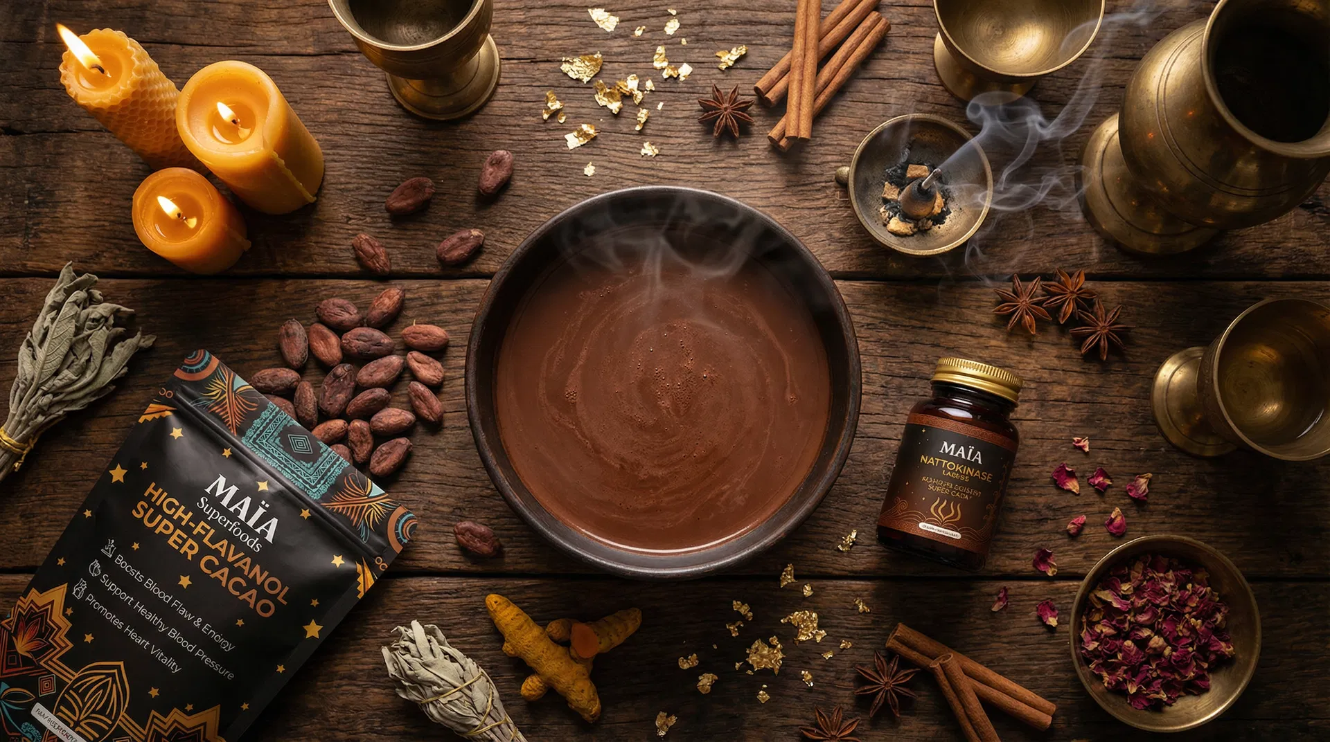 MAÏA is built around ancient remedies backed by modern science. We don't chase trends - every ingredient must be historically grounded, mechanistically sound, and biologically relevant. Our products use ceremonial-grade cacao with up to 10x more flavanols than regular cocoa, and pharmaceutical-grade nattokinase at clinically studied dosages.